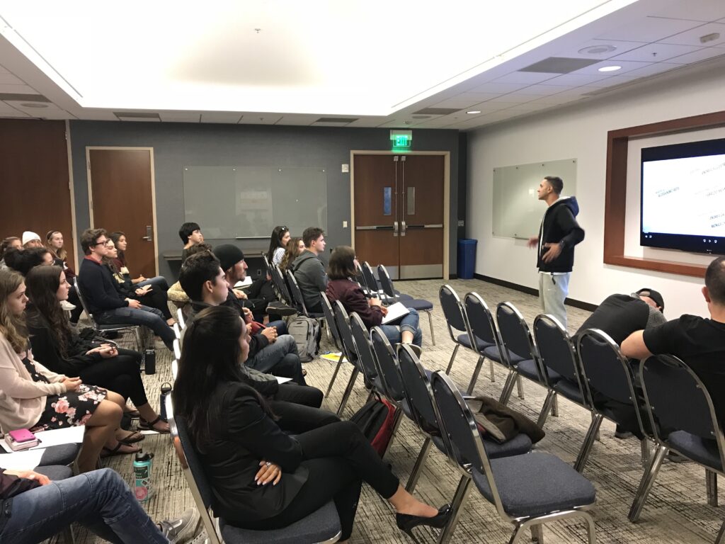 This past week, Chapman Italian Studies students had the opportunity to participate in an Italian rap workshop by Amir Issaa, a rapper from Rome who is touring the United States to share his story, talent, and ideas. Amir is a child of an immigrant Egyptian father and an Italian mother. Amir’s lyrics are well-known in Italy, and he has become a point of reference for today’s Italian youth of different national family backgrounds. Amir guided students through a lesson on rhyme in Italian along with a discussion on the issues in Italy and ended with a live performance of his original songs.
