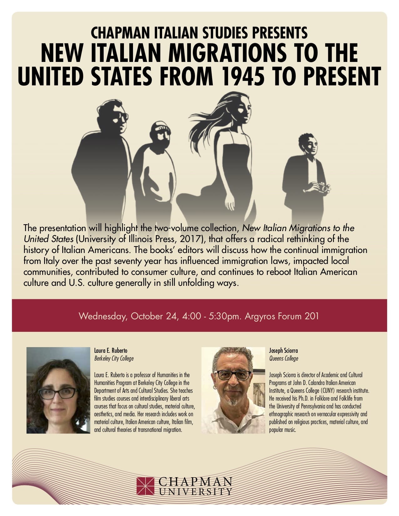 The presentation will highlight the two-volume collection, New Italian Migrations to the United States (University of Illinois Press, 2017), that offers a radical rethinking of the history of Italian Americans. The books’ editors will discuss how the continual immigration from Italy over the past seventy year has influenced immigration laws, impacted local communities, contributed to consumer culture, and continues to reboot Italian American culture and U.S. culture generally in still unfolding ways.