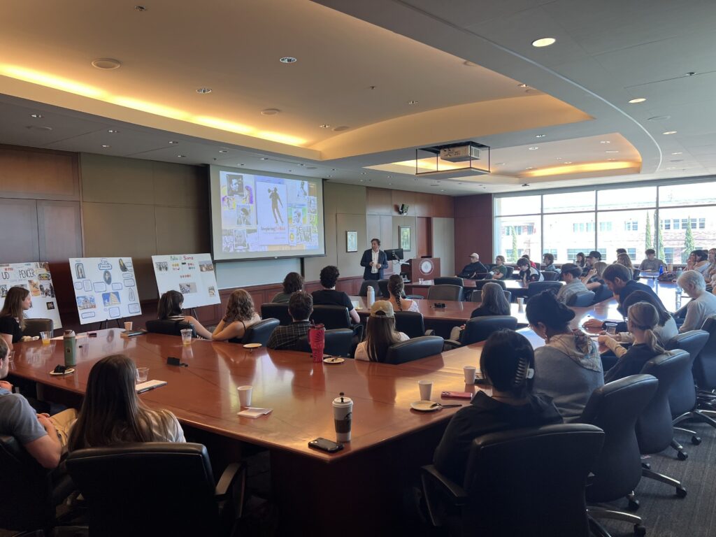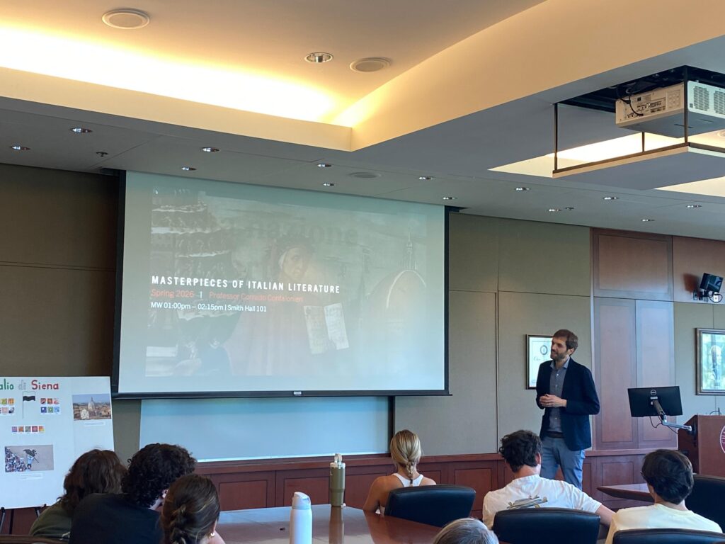 On April 20th, the Ferrucci Institute for Italian Experience and Research and the Italian Studies Program, in collaboration with the Institute of Italian Culture in LA and the ISSNAF launched the inaugural annual Day of Italian Research in the World at Chapman University. The event, attended by Chapman students, Ferrucci Institute Fellows, and members of the community, provided an opportunity to discuss the cultural significance and genesis of memorialized Italian figures. The event began with a talk by Dr. Pacchioni examining the process through which the filmmaker Federico Fellini crafted a mythical, yet self-ironic, artist persona through the unique style of his cinema, autobiographical references, and by tackling issues of national identity. Following, three groups of students from Dr. Confalonieri’s advaced Italian Studies course “Masterpieces of Italian Literature,” shared their assessment of iconic places and figures of Italian culture through posters and oral presentations.